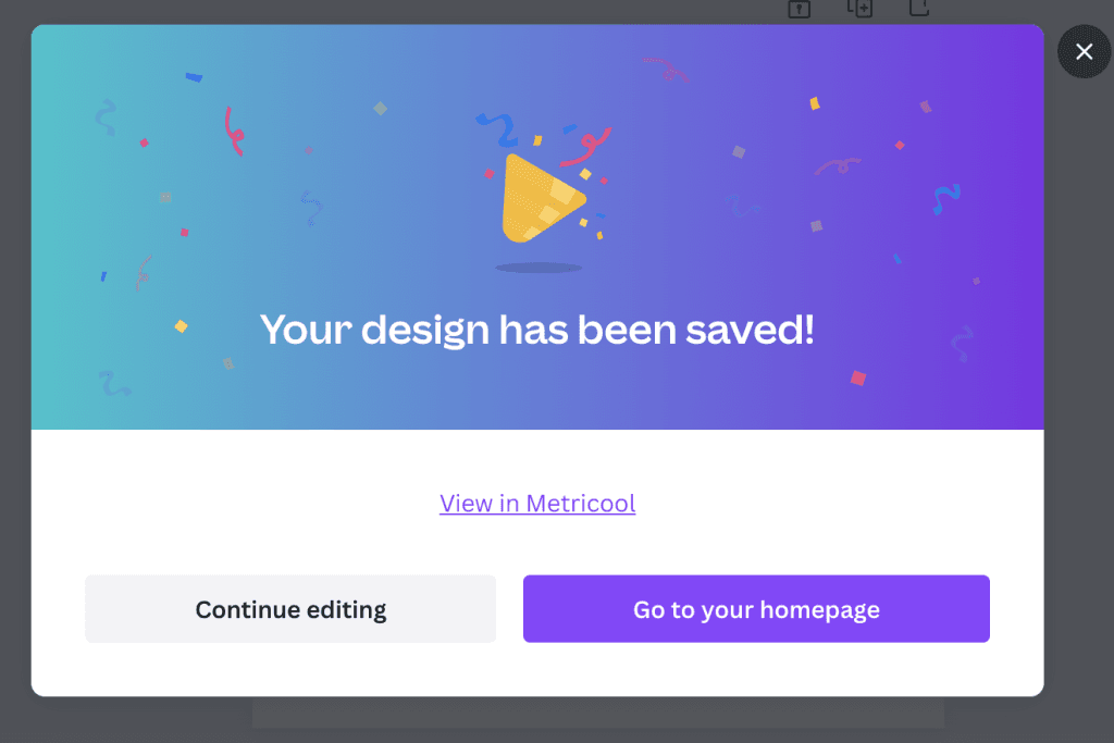 - Canva will show you a pop-up window for ‘Continue editing’, ‘Go to home page’, or ‘View on Metricool’. Click on the latter.