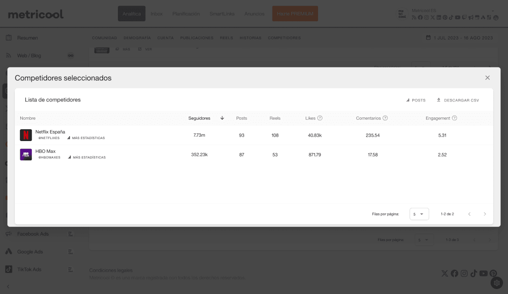 Para obtener los datos puedes hacerlo a mano, buscando competidor por competidor y apuntar los datos que te interesan. Pero también lo puedes hacer con Metricool, donde tendrás a golpe de clic toda la información que necesitas.